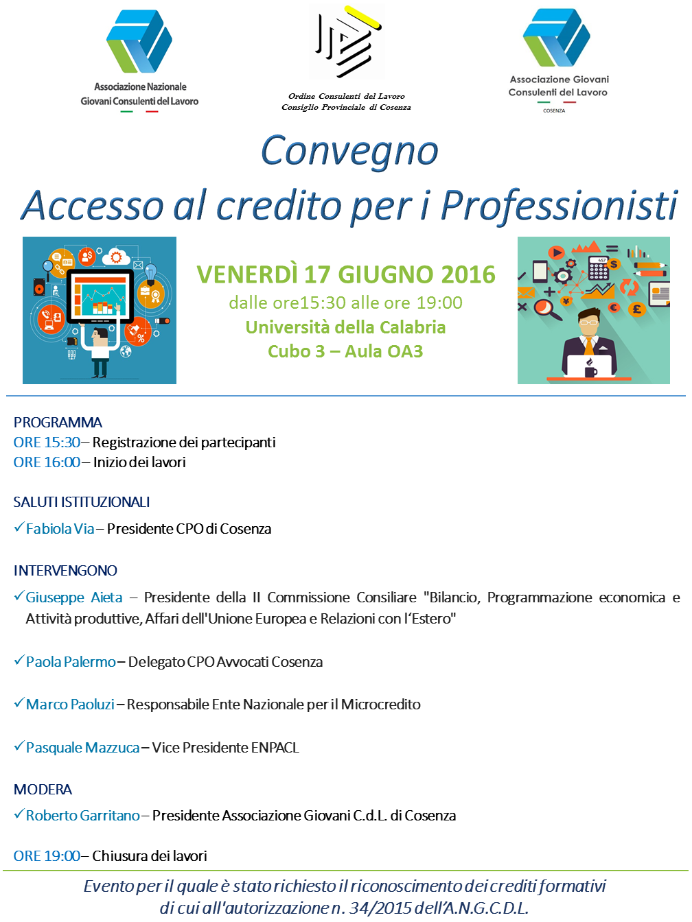 di Redazione - Si terrà venerdì 17 giugno 2016, presso l'Università della Calabria, il convegno "Accesso al credito per i professionisti" organizzato dall'ordine dei Consulenti del Lavoro della provincia di Cosenza, insieme all'Associazione Nazionale e provinciale dei giovani Consulenti del Lavoro. Un confronto e un approfondimento quanto mai necessario su una tematica che interessa chi ha già una professione avviata, ma anche i giovani alle prime armi, che con passione e costanza, vogliono intraprendere una carriera in autonomia.