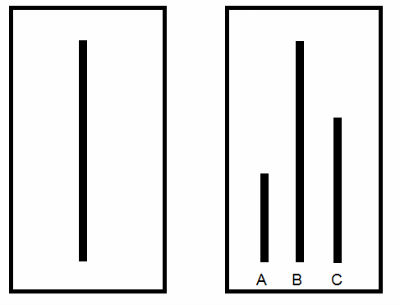 In uno studio del 1951, Solomon Asch portò uno studente universitario alla volta in una stanza, con altre otto persone presentate come partecipanti allo studio, ma in realtà complici dello psicologo. Successivamente, il ricercatore presentò loro delle schede raffiguranti tre linee di differente lunghezza; su un'altra scheda era invece disegnata una linea, della stessa lunghezza di una delle tre linee. Venne, quindi, chiesto ai complici quali fossero le linee della stessa lunghezza delle due schede e questi iniziarono a fornire risposte concordi, ma chiaramente errate. I veri soggetti su cui s'incentrava l'esperimento, iniziarono in molti casi a rispondere anch'essi in modo sbagliato, conformemente alla maggioranza che aveva risposto prima di loro. Pur essendo a conoscenza della risposta giusta, in quanto inequivocabile, il soggetto decideva volontariamente di omologarsi alla maggioranza. Solo una piccola percentuale si distaccava dal gruppo, dichiarando ciò che vedeva realmente, anziché ciò che sentiva di "dover" dire.